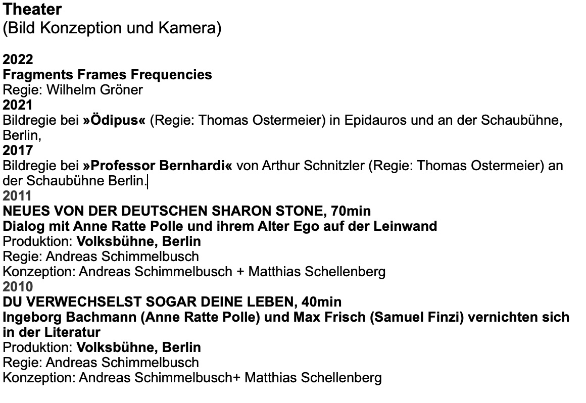 Als Regisseur und Autor drehte er in den letzten Jahren mehrere Dokumentarfilme für Arte und 3 Sat über die Gastspiele der Berliner Schaubühne in der Welt, diese wurden zu einer intensiven Reise über die politische Kultur u.A. in Istanbul, Moskau, London, Minsk, Santiago, Seoul, Dehli, Kolkata und Chennai. Für Arte hat er mehrere Folgen der Serie “Durch die Nacht mit” und Folgen für Arte Reportage Reihe ArteRe gedreht. Zur Zeit arbeitet er u.A. mit Kolya Reichart und der Filmproduktion Flare Film an dem Kinodokfilm „Wir sind die Zukunft“ ein Film über Jungpolitikerinnen der uns in die Innenwelten der politischen Ränder der dt. Parteienlandschaft bringt und mit Andreas Nickl und der Firma Datenstrudel an dem Filmprojekt: „Wie zeige ich ihn, nicht“ Über einen Illegalen Menschen in Berlin.